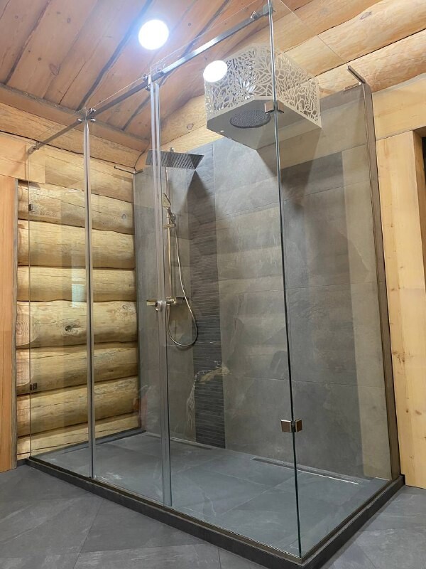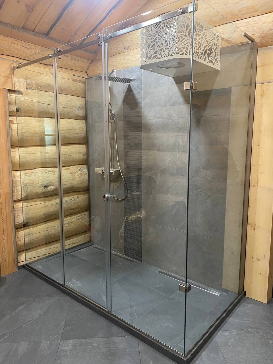 Душевое ограждение изготовлено из бесцветного закаленного стекла толщиной 8 мм. Несмотря на внушительные габариты, конструкция обладает высокой жесткостью. Устойчивость обеспечивается качественной фурнитурой: стекла фиксируются в П-образном профиле, а сверху крепятся к стене стабилизационными уголками. Это позволило отказаться от массивной верхней обвязки без потери прочности. Угловые коннекторы (90°) создают дополнительное ребро жесткости, что гарантирует надежность всей системы с откатной дверью. Механизм открывания работает плавно и бесшумно. Фурнитура выполнена из нержавеющей стали в цвете «матовый хром».